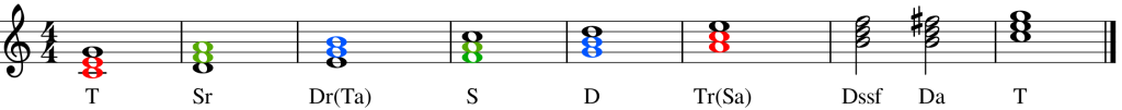 Note que a harmonia, nesse caso, contempla somente três acordes, ainda que invertidos: a tônica (C - Dó Maior), a subdominante (F - Fá Maior) e a dominante (G - Sol Maior). Temos, então, as três principais funções de acordes quando falamos sobre sistema tonal.